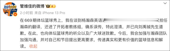 同时,管维佳也发布微博致歉,称“杨瀚森的翻译刘禹铖进入开拓者的教练组”的消息系误传。