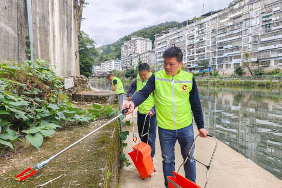 暖阳下,龙胜烟草工作人员正手持夹子、垃圾篓,沿着桑江河道仔细清理。草丛中的烟头、石缝的塑料袋、岸边的废气瓶罐等,都被一一捡起装入篓中。