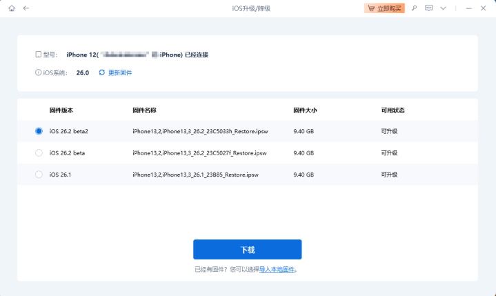 步骤2:选择升级功能,点击【升级】获取可升级iOS固件